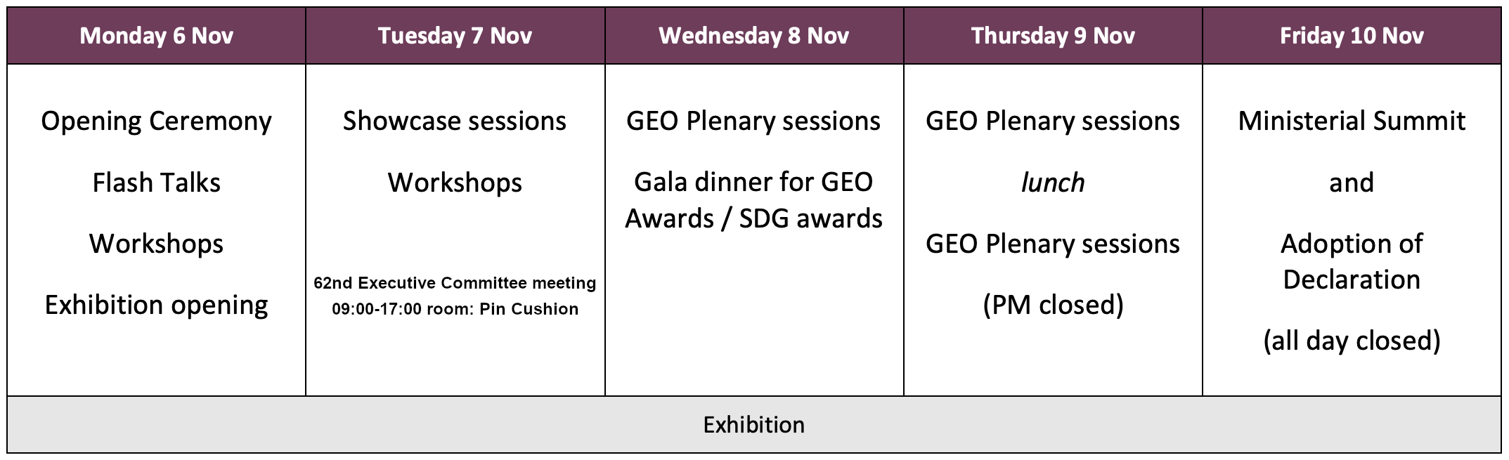 - Days 1, 2 and 3, as well as the morning of Day 4 are open to all registered attendees. The afternoon of Day 4 and the Ministerial Summit are only open to GEO Delegates and Ministers. Please note that while thematic sessions during the plenary are open to non delegates, any decisions will be made by GEO Members present.