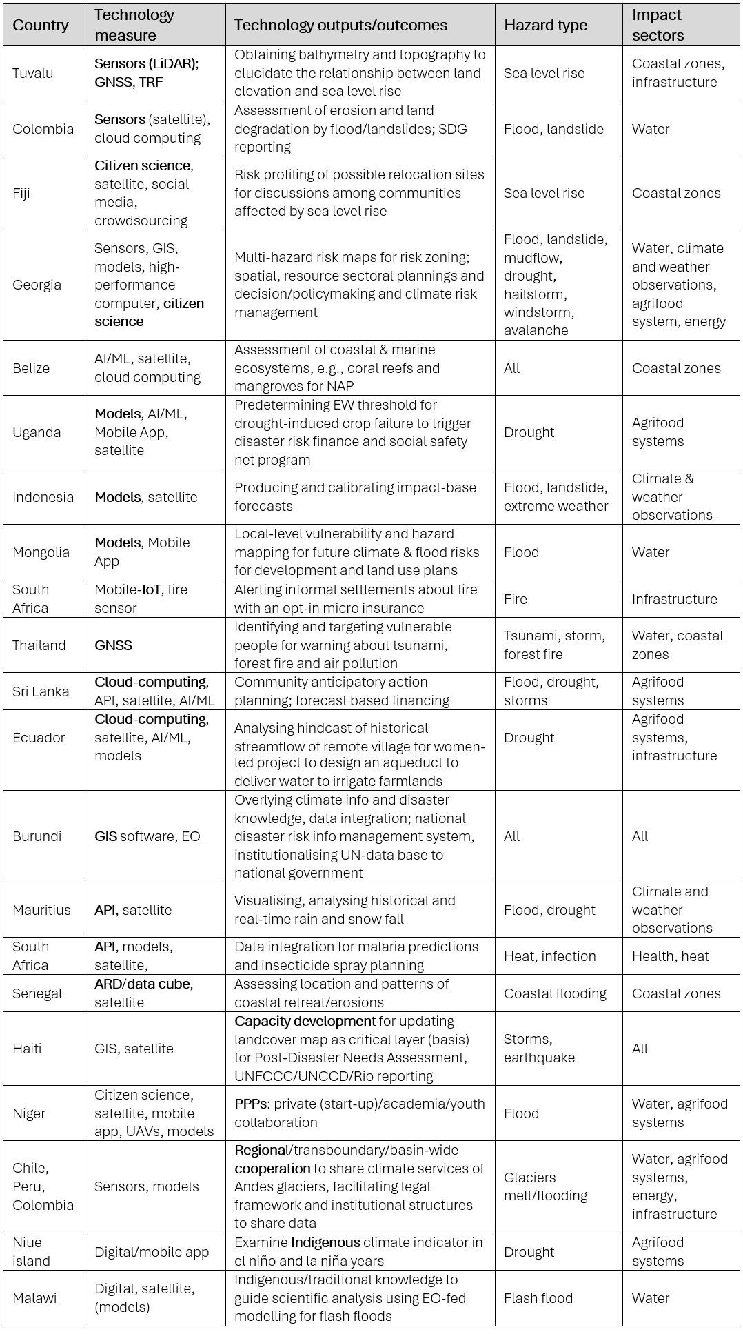 Titled “Realising Early Warnings for All: Innovation and Technology in Support of Risk-Informed Climate Resilience Policy and Action”, the policy brief highlights 21 use cases of scalable technology solutions, with nine of them coming from GEO Work Programme activities and seven showcasing the efforts of GEO Participating Organisations.